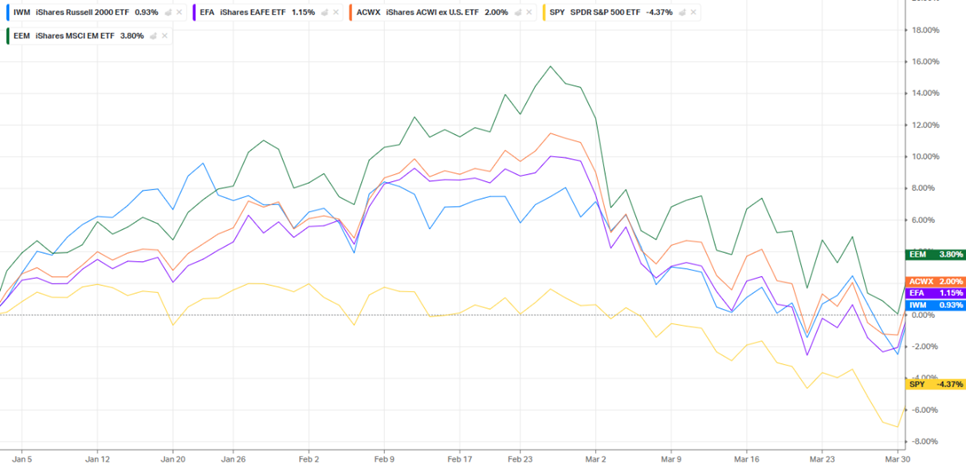 International equities rose to start the year and maintained double-digit performance through mid-February but fell near the end of the quarter, similar to the domestic market.