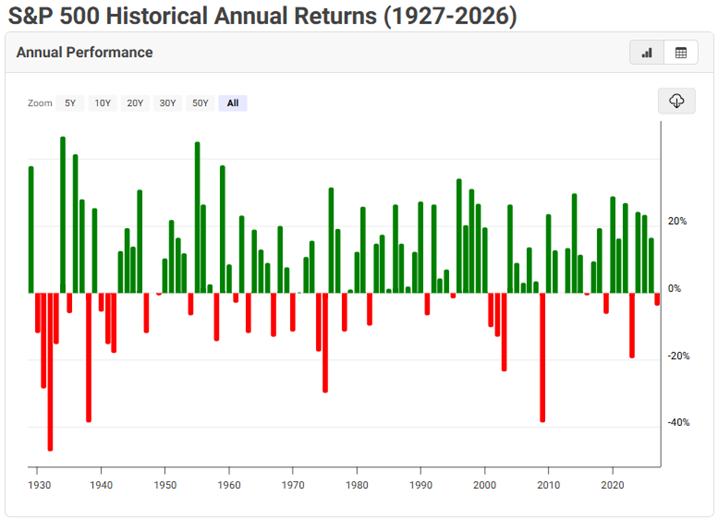 Historically, quarterly declines similar to what we experienced in Q1 are relatively common following multi‑year advances. Markets rarely move in straight lines, and short‑term volatility does not change the long‑term return profile of equities.