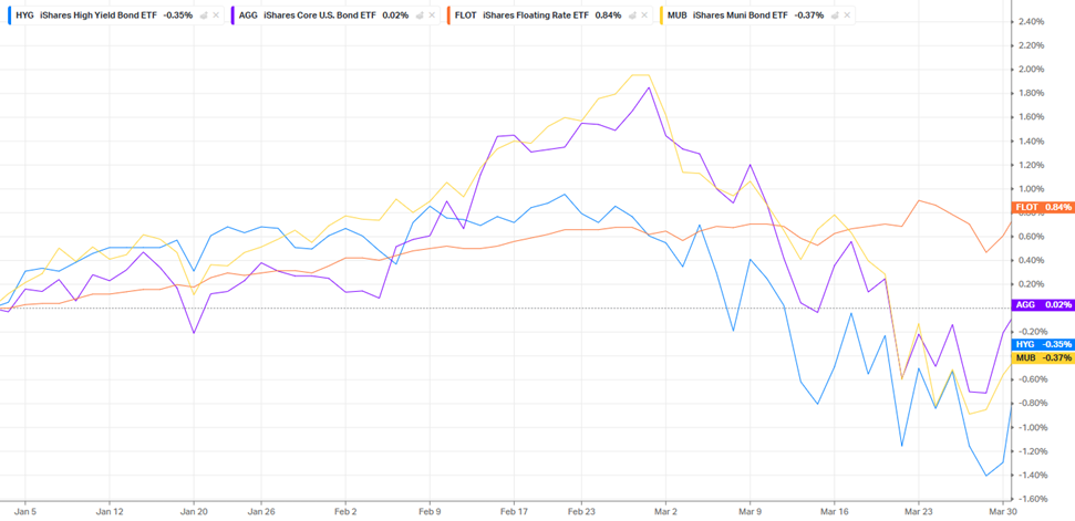 Municipal bonds, represented by MUB, outperformed all other fixed income indices through mid-February but fell near the end of the quarter.