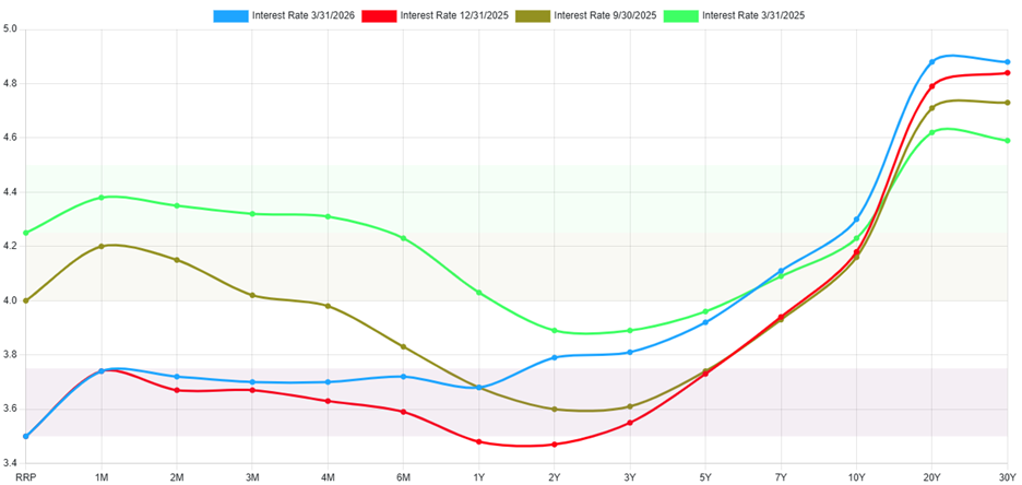 The yield curve below helps explain the quarter’s bond performance. Compared to the end of 2025, shorter‑term yields moved modestly higher during the quarter as markets reassessed the timing of future rate cuts. Longer‑dated yields also rose, reflecting increased inflation uncertainty tied to energy prices and geopolitical developments.
