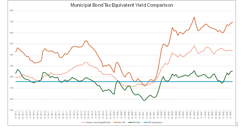 Our allocation to the national municipal bond market reflects an ongoing commitment to aligning investment strategy with client objectives and current opportunities. The combination of attractive nominal and tax-equivalent yields, strong credit quality, and broad diversification makes municipal bonds a key component of our fixed income strategy.